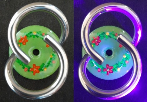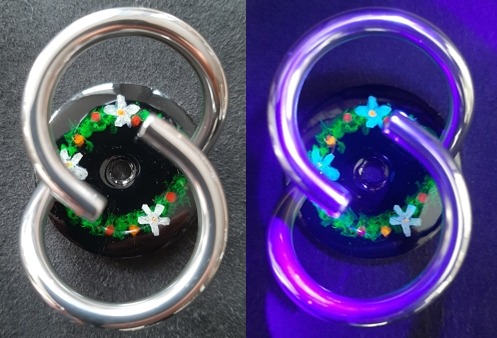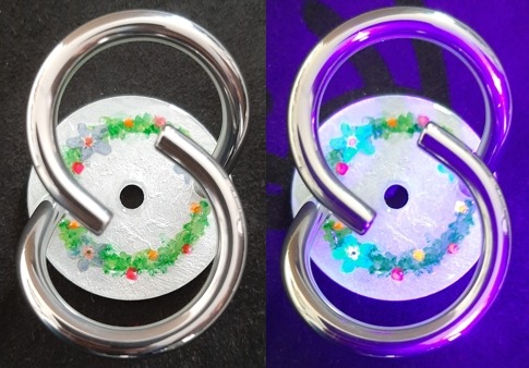 Blumenkranz auf metallweiss mit Vergissmeinnicht. Sie leuchten unter dem UV-Licht. 20260210.