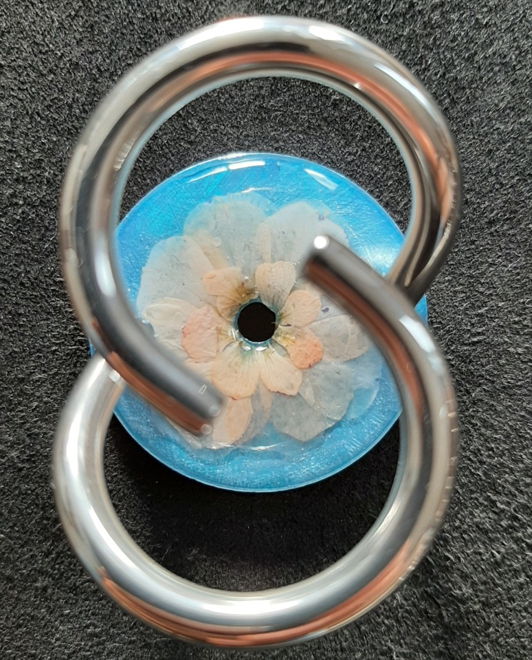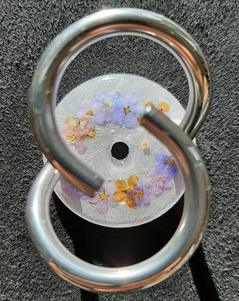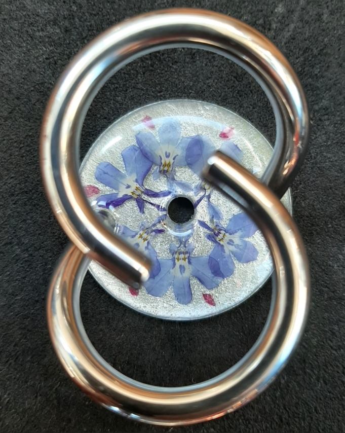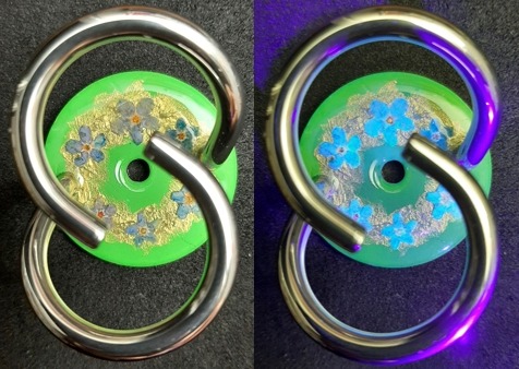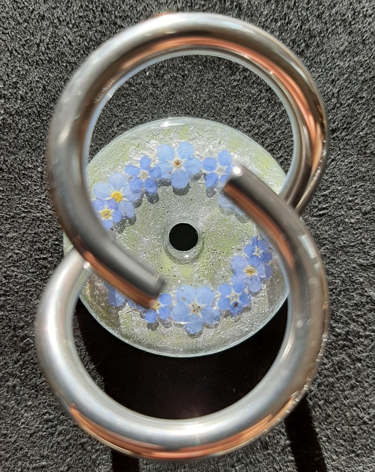 Blumenkranz auf metallweiss mit Vergissmeinnicht. Sie leuchten unter dem UV-Licht. 20260302.