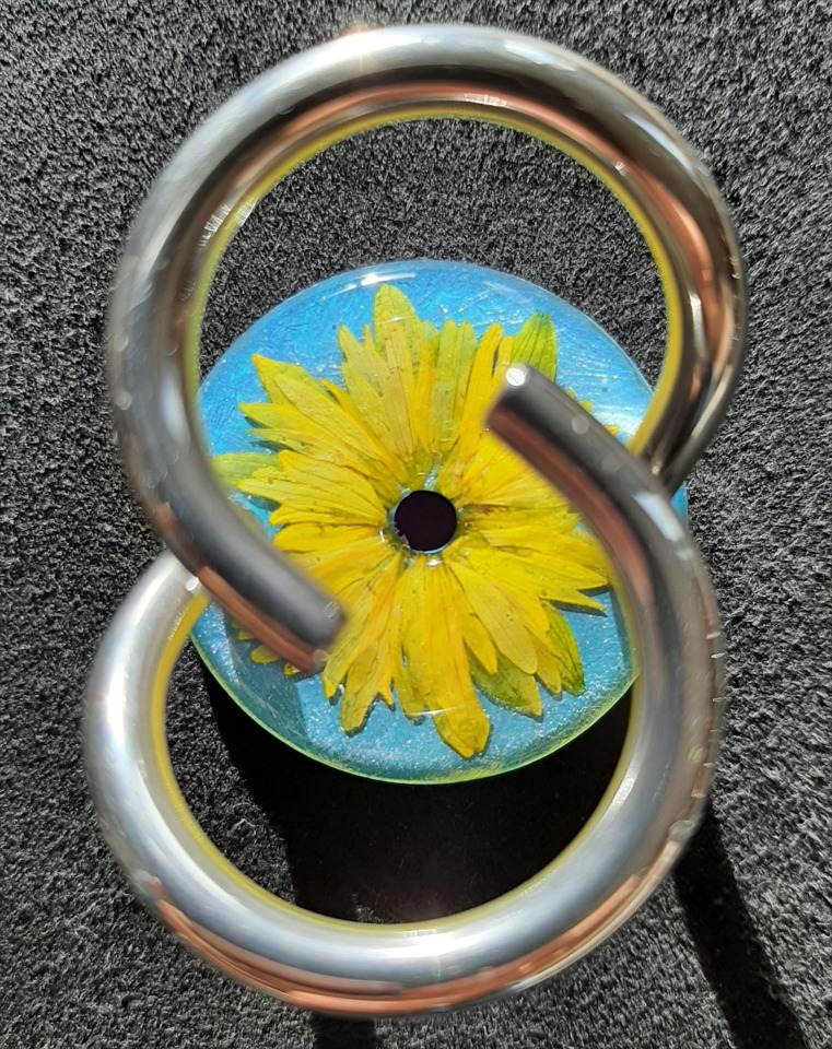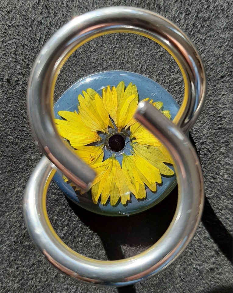 Kornblume weisslich auf grau mit schwarzem Glitter rundum. 20250119