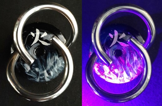 Hi (= Feuer) auf schwarz. Unter dem UV-Licht erscheit eine Framme. 20260130.